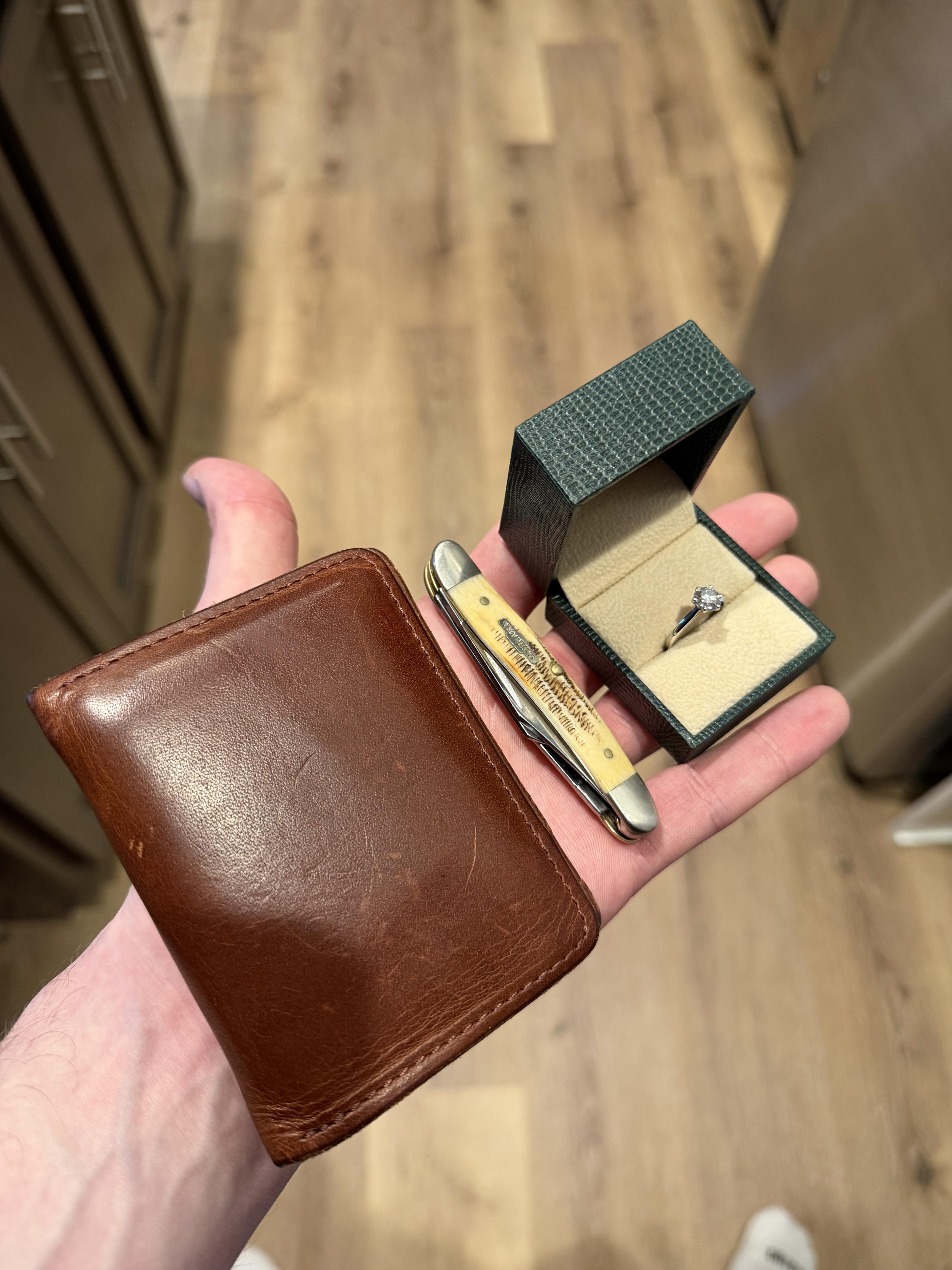 In EDC Proposal Day Carry April 18, 2026 Wish me luck, gents Ashland Leather walletCase 3-Blade Slip joint Knife (specific type unknown)Engagement Ringby planetmonkeys EDC Prev Post Morning hustle 💴 Let me see what you got fellow knife geeks April 18, 2026 Next Post Help me find one! April 18, 2026 Related Posts New knife day. Came home to the Parallel from Vosteed. When it is said that it is thin, it really is. April 22, 2026 Current Rotation April 22, 2026 Springtime adventure carry:) April 22, 2026 1 Comment AutoModerator 4 days ago Thank you for posting to r/EDC! Include a detailed item list (make/model) within **1 hour** of submission. Lists can go in the title, a comment, or the image. Posts without lists will be removed. If you have already provided a list, not further action is needed, thanks | [FAQ](https://www.reddit.com/r/EDC/wiki/faq)*I am a bot, and this action was performed automatically. Please [contact the moderators of this subreddit](/message/compose/?to=/r/EDC) if you have any questions or concerns.*Write A CommentYou must be logged in to post a comment.