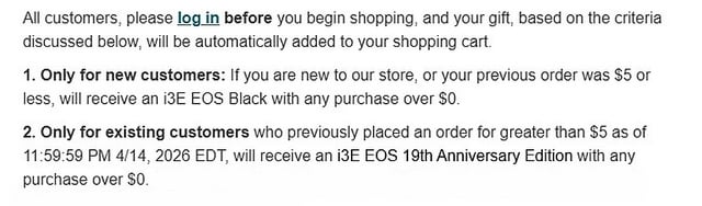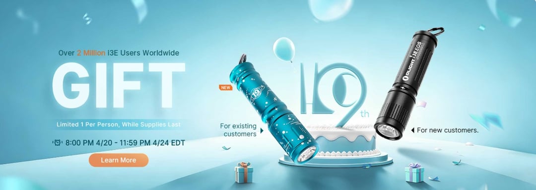 Existing customers: Free i3E 19th Anniversary Edition light with any purchase over $0. Standard shipping charges.
