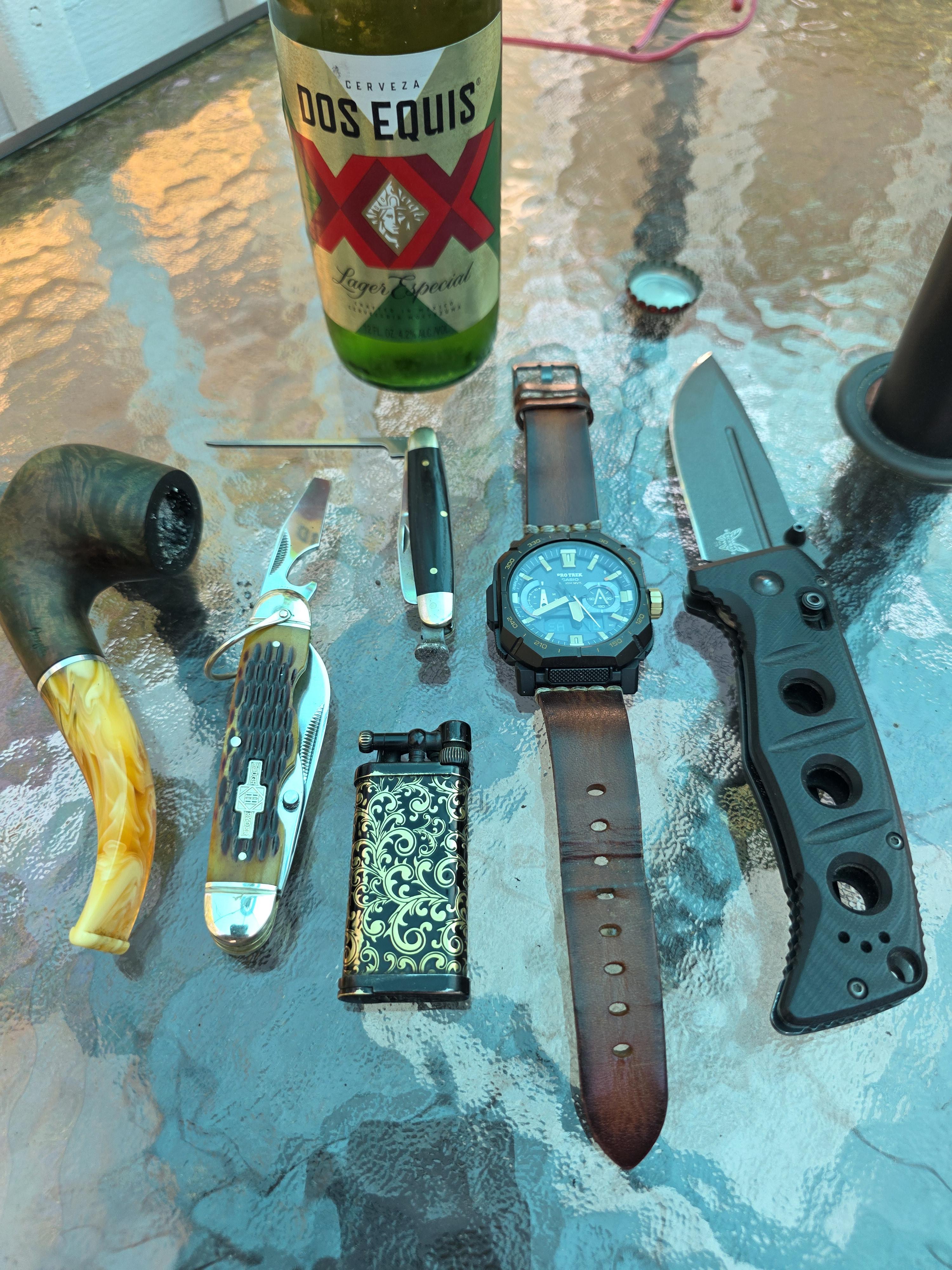 In EDC Friday afternoon grilling steaks carry April 18, 2026 Benchmade Adamas 275 Casio ProTrek PRW B1000 IM Corona Old Boy pipe lighter Rogers of Sheffield pipe tool Rough Ryder Utility Knife Angelo briar pipe Dos Equis Cerveza by BlastTyrantKM EDC Prev Post Like an idiot, I mistakenly deleted my #1 post of all time, so had to post another pic of my OZ Rosie. April 18, 2026 Next Post My first SOTC April 18, 2026 Related Posts Today’s EDC April 23, 2026 Tactical iPad kit 😂 April 23, 2026 Upgrade compete! April 23, 2026 1 Comment AutoModerator 4 days ago Thank you for posting to r/EDC! Include a detailed item list (make/model) within **1 hour** of submission. Lists can go in the title, a comment, or the image. Posts without lists will be removed. If you have already provided a list, not further action is needed, thanks! [Rules](https://www.reddit.com/r/EDC/wiki/rules) | [FAQ](https://www.reddit.com/r/EDC/wiki/faq) *I am a bot, and this action was performed automatically. Please [contact the moderators of this subreddit](/message/compose/?to=/r/EDC) if you have any questions or concerns.* Write A CommentYou must be logged in to post a comment.