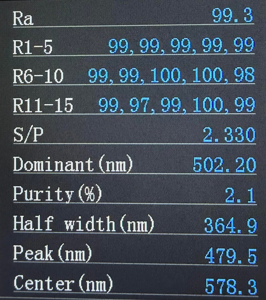 At 1pm, it measured 5700k, 99.3 Ra with 0.0014 DUV. As you would expect R1 through R15 are high across the board.