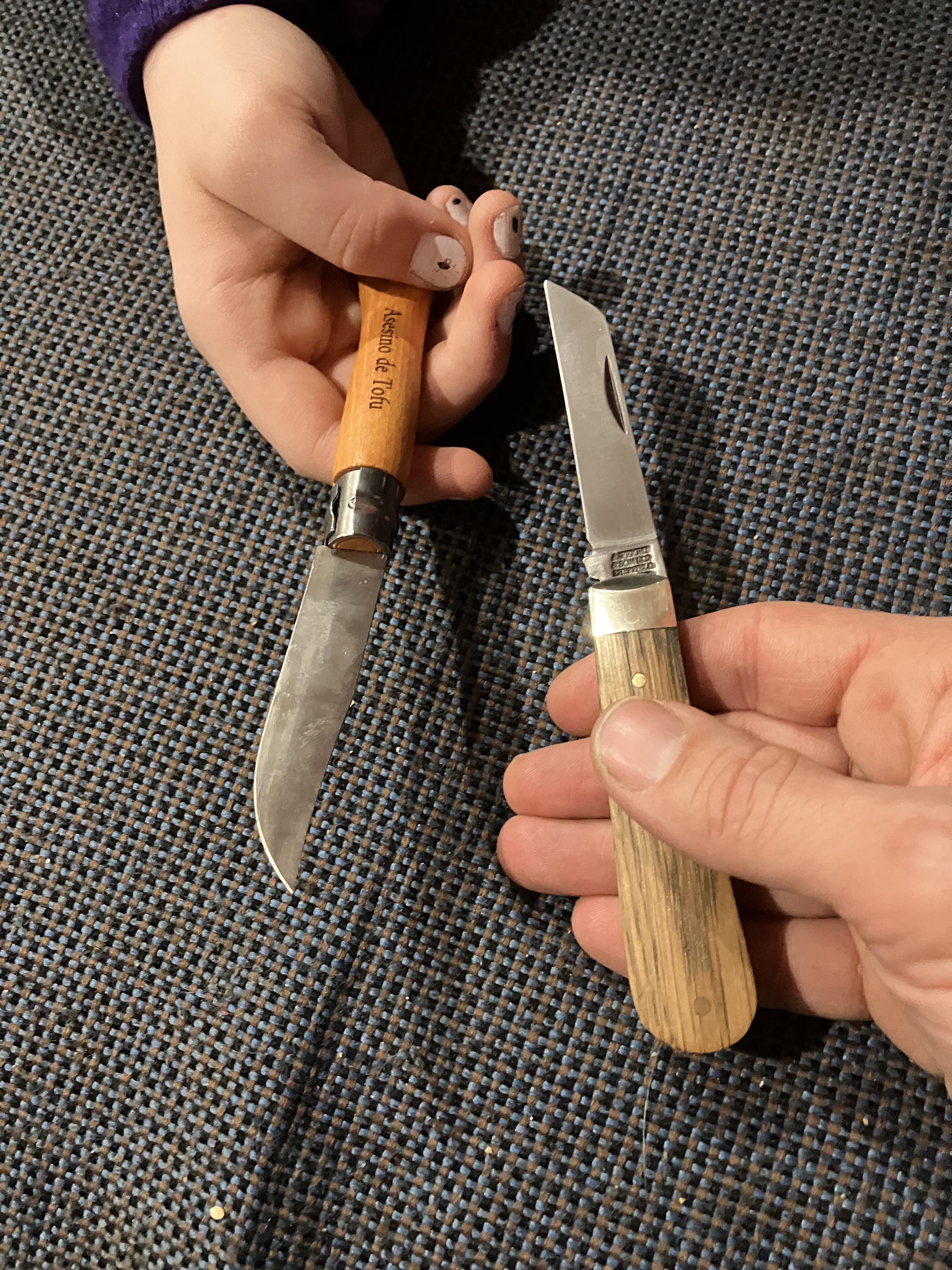 Not asking to be creepy. Here’s the thing: I got my two oldest kids (14F and 10M) Opinels as training knives. They both go to a summer camp that does back country excursions, and lets the older kids have knives on those, so 14F asked if she could bring hers. We talked it over and decided the XC90 steel, which rusts when you look at it funny, wasn’t a good match for the climate and the supplies she’d have with her. I asked her if she would consider bringing a different knife, and she immediately said “I want a donut knife!”