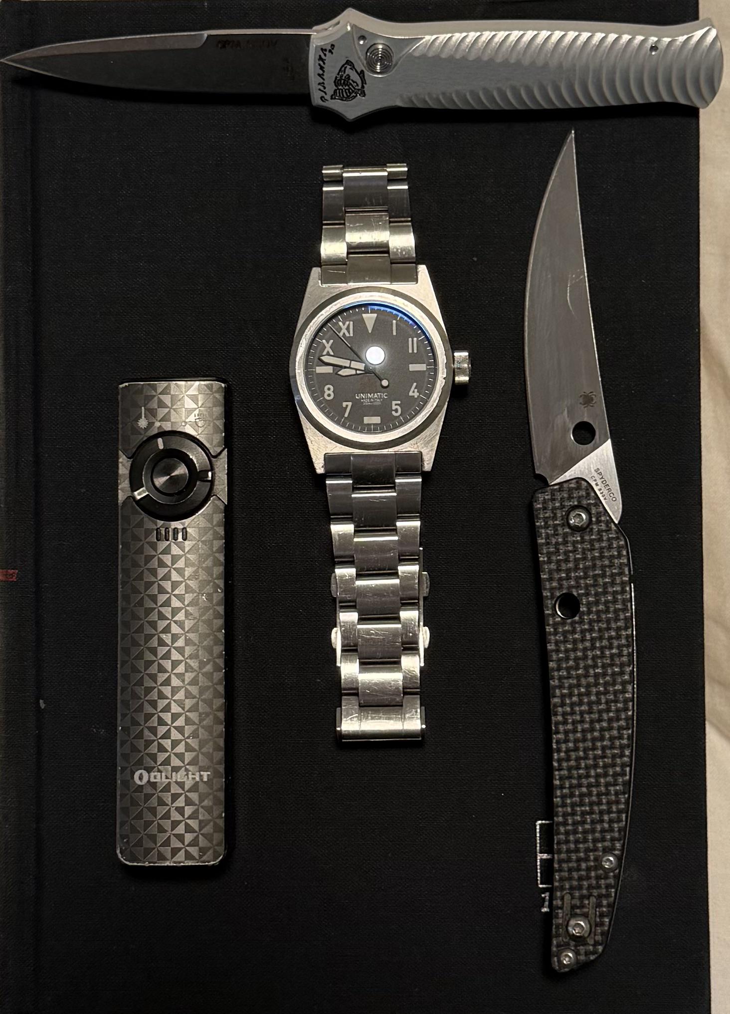 Today I’m carrying the O-Light Arkfield, Unimatic U2-H on Unimatic Stainless Steel Bracelet, Spyderco Ikuchi, and Titanium Piranha switchblade with S30V bayonet blade. The Spyderco is great for a traveling food prep knife!
