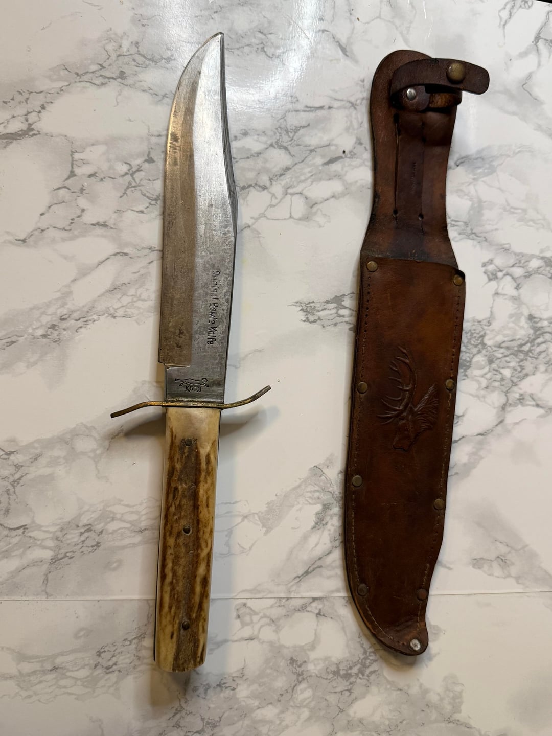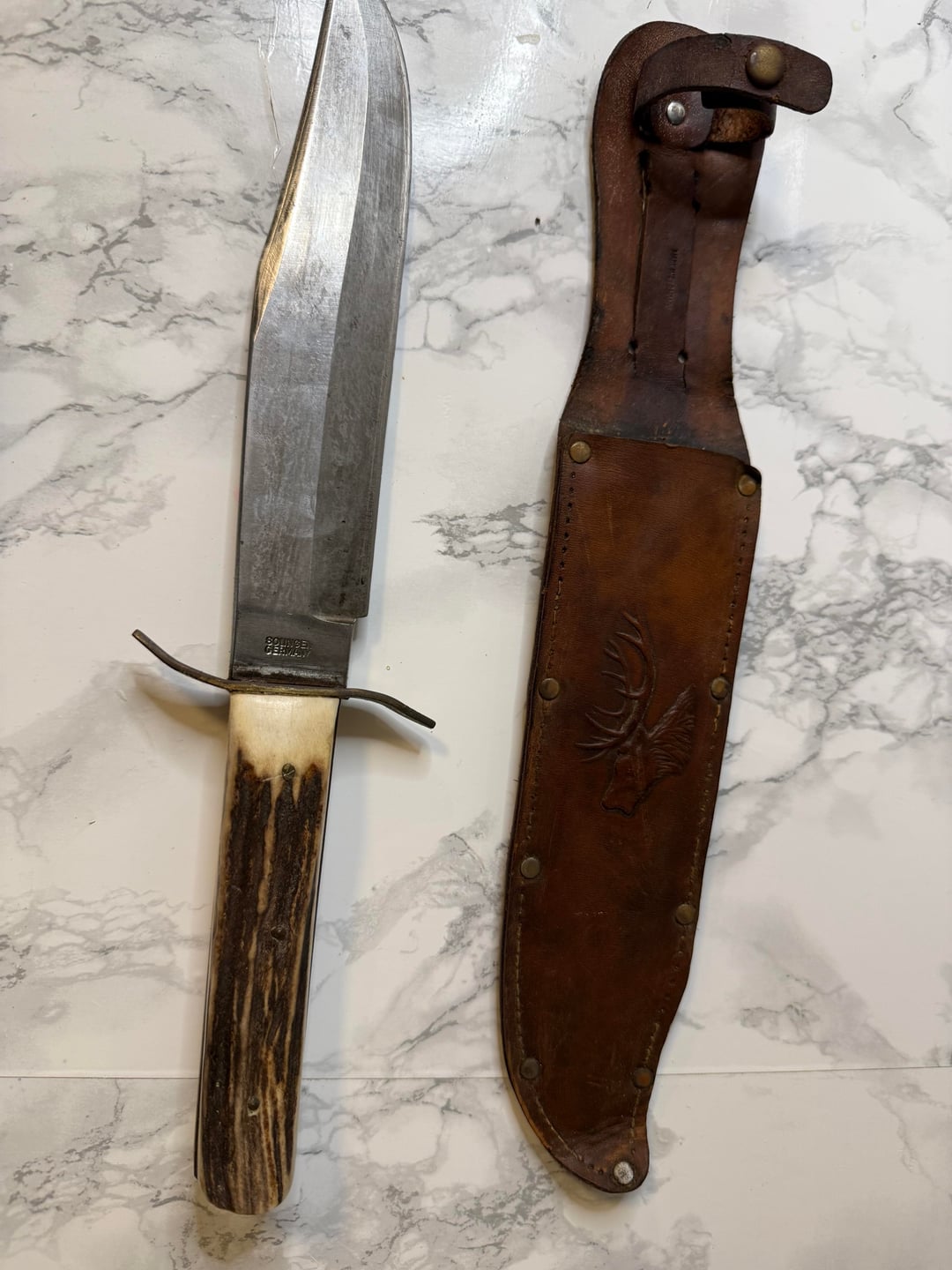 It was made by Kaufman and Sons (1856 to 1995), same company that made the famous black cat pocket knife. Not sure about the date, sometime mid-20th century I’d guess. Looks like a carbon steel blade, so I’d consider oiling it and not storing in the sheath to avoid rust. German and English made bowies were actually really common in the US all through the 19th century.