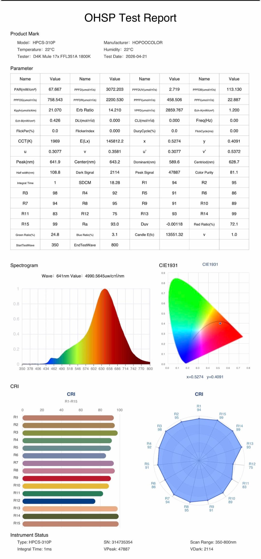 Spectrophotometer results on pic 7. The light reads about 1970K, which is slightly higher CCT than rated, but it scores very respectable CRI numbers: