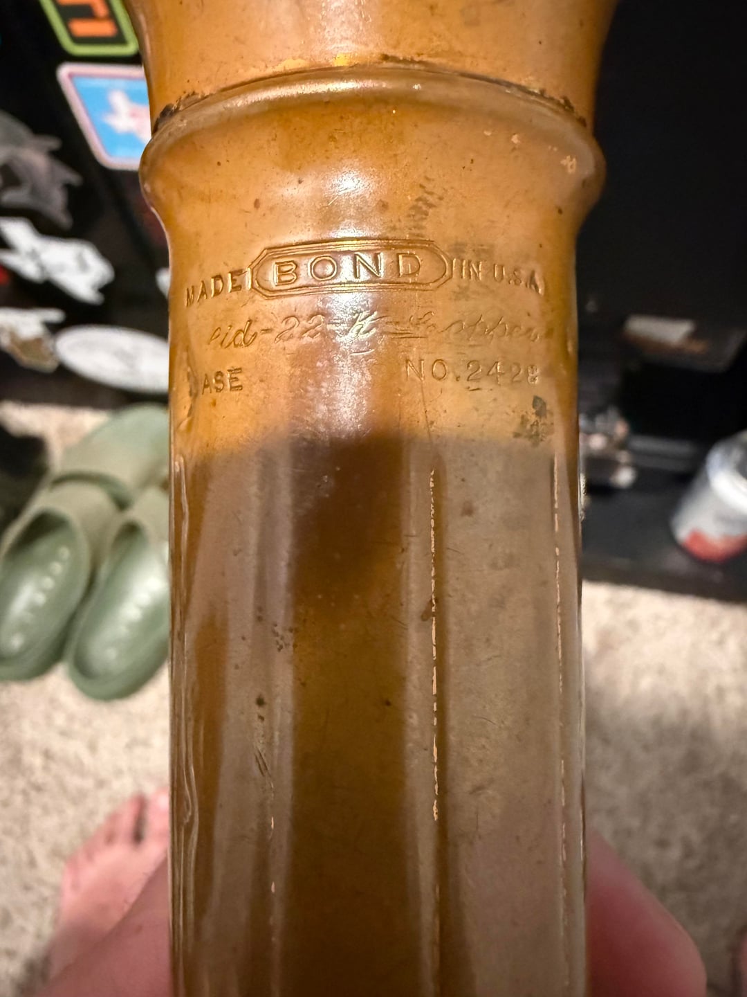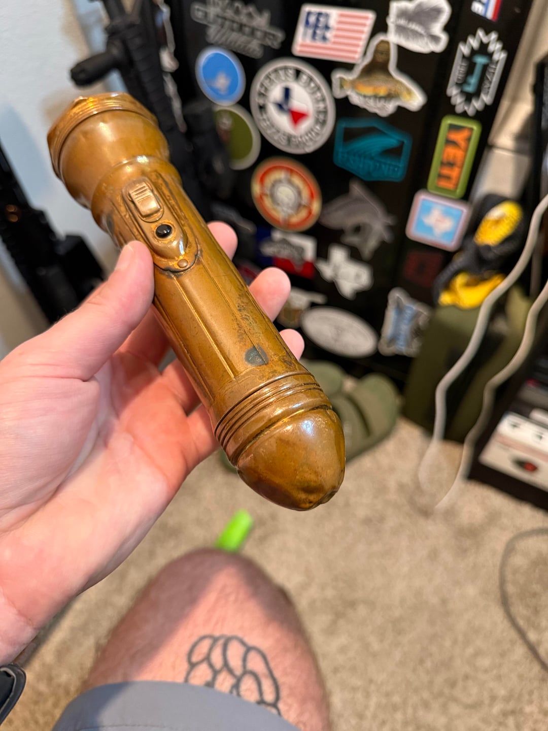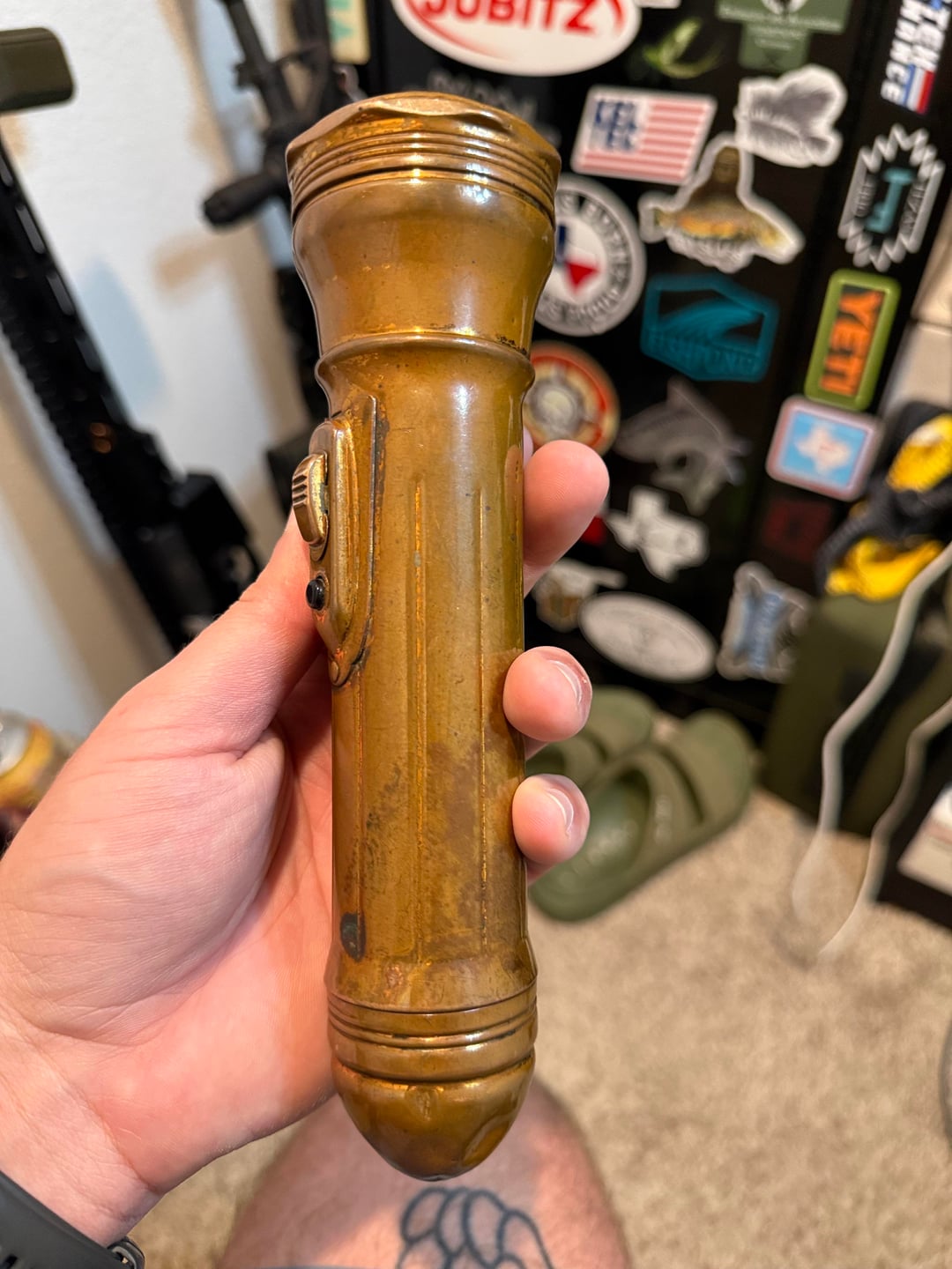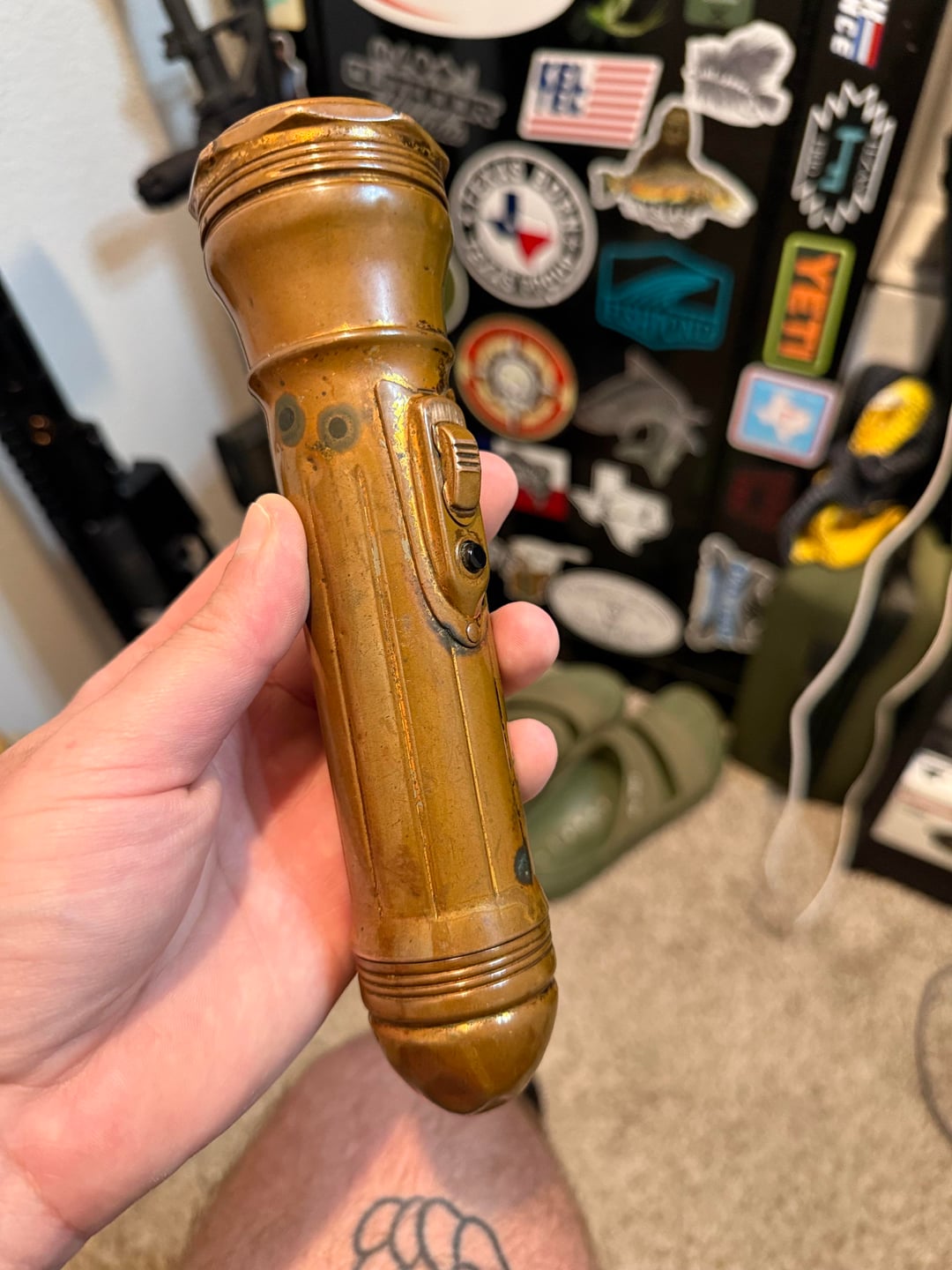 I recently found this in an antique store for 30$ not working. I cleaned up the connectors and found a bulb that would fit and got it working again. It takes two D cell batteries. The small black button is a momentary on off.