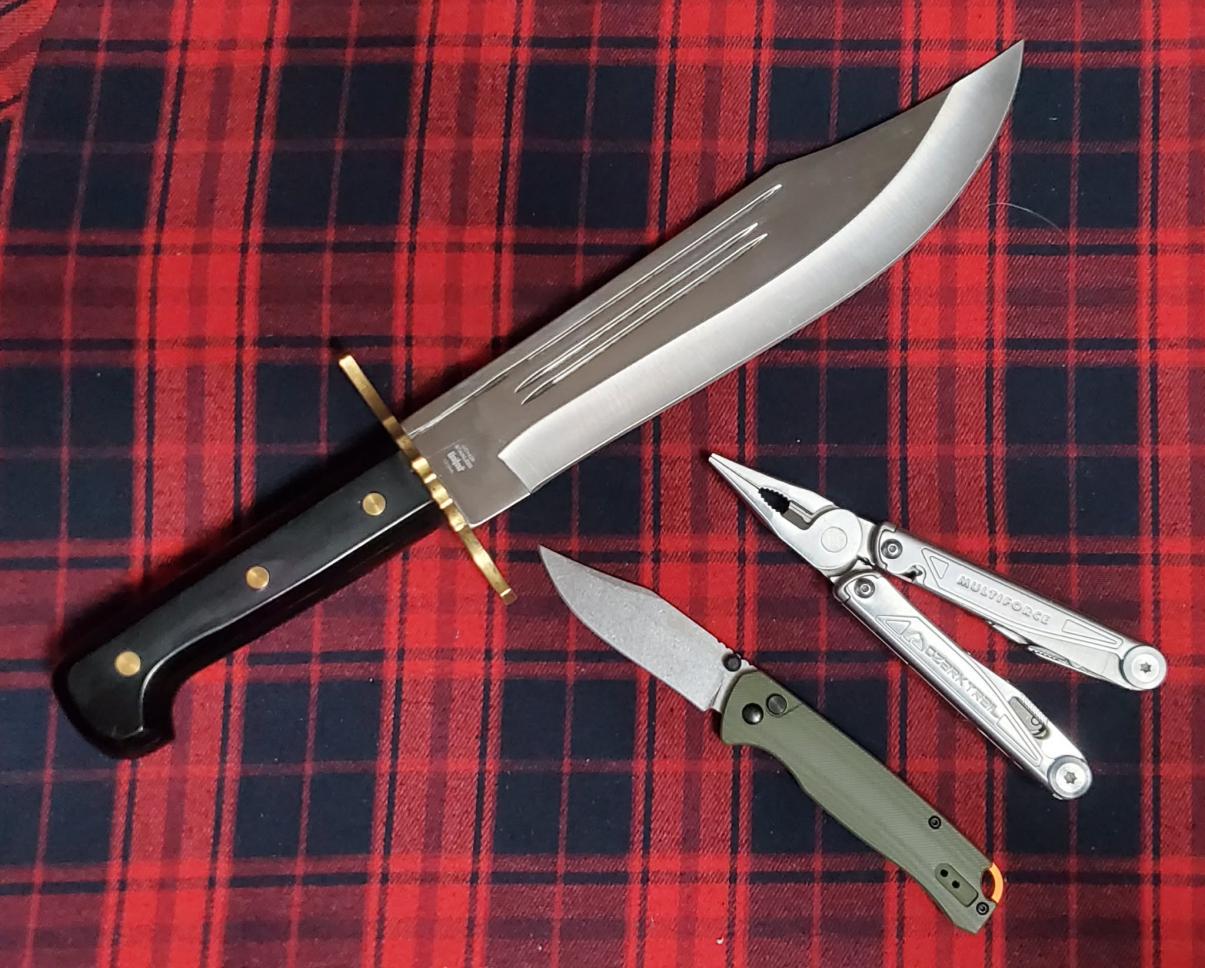 United Cutlery UC1246 bowie as my defense choice, actually love this knife, just hate the sheath. Ozark Trail Ozark Trail 2407 Elevation as my EDC knife, decent 12C27 blade, super smooth action and good lockup. Ozark Trail Multiforce as my multitool choice for the day, but I carry it in a Leatherman Wave sheath.