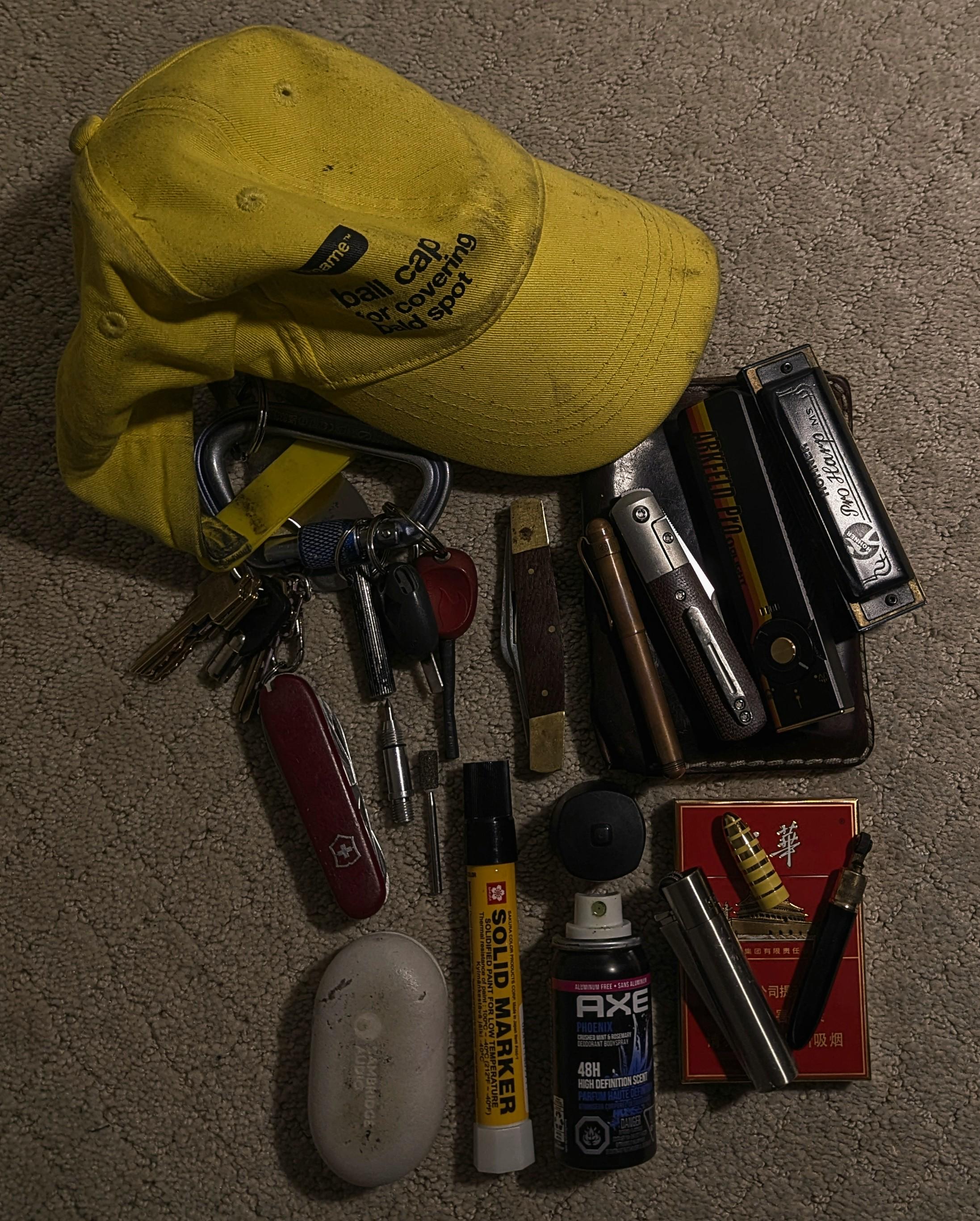 *Ball cap for covering bald spot *Hohner Harmonica *Olight arkfeld pro *Black diamond carabiner *Enrique Pena brown micarta Barlow *Old slip joint I found at a garage sale *Kawaco Lilliput copper *Leather wallet with Moleskine notebook(not pictured) *Keys *Swiss Army climber knife *Carbide tip scratch tool *Steel striker (for Ferro rod) *Ferro rod *Dremel scratch tool Sakura low temp solid marker black *Chunghwa ciggarettes *Vintage kerosene lighter I found at an antique store *Steel clipper lighter *Mini axe can (refilled with key lime green rustoleum 2X paint) * Melomania touch earbuds