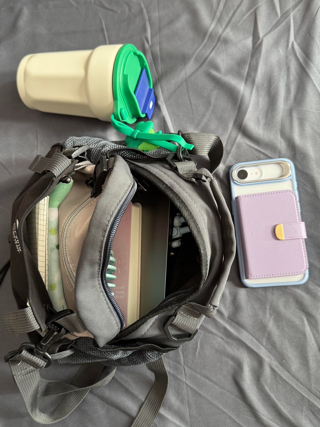 My mom always says my bag looks too “masculine,” but it’s honestly so practical. It’s small but fits a lot, and even when it’s full it doesn’t look bulky. I’d much rather carry this than a bigger, heavier bag that puts more strain on my shoulders.