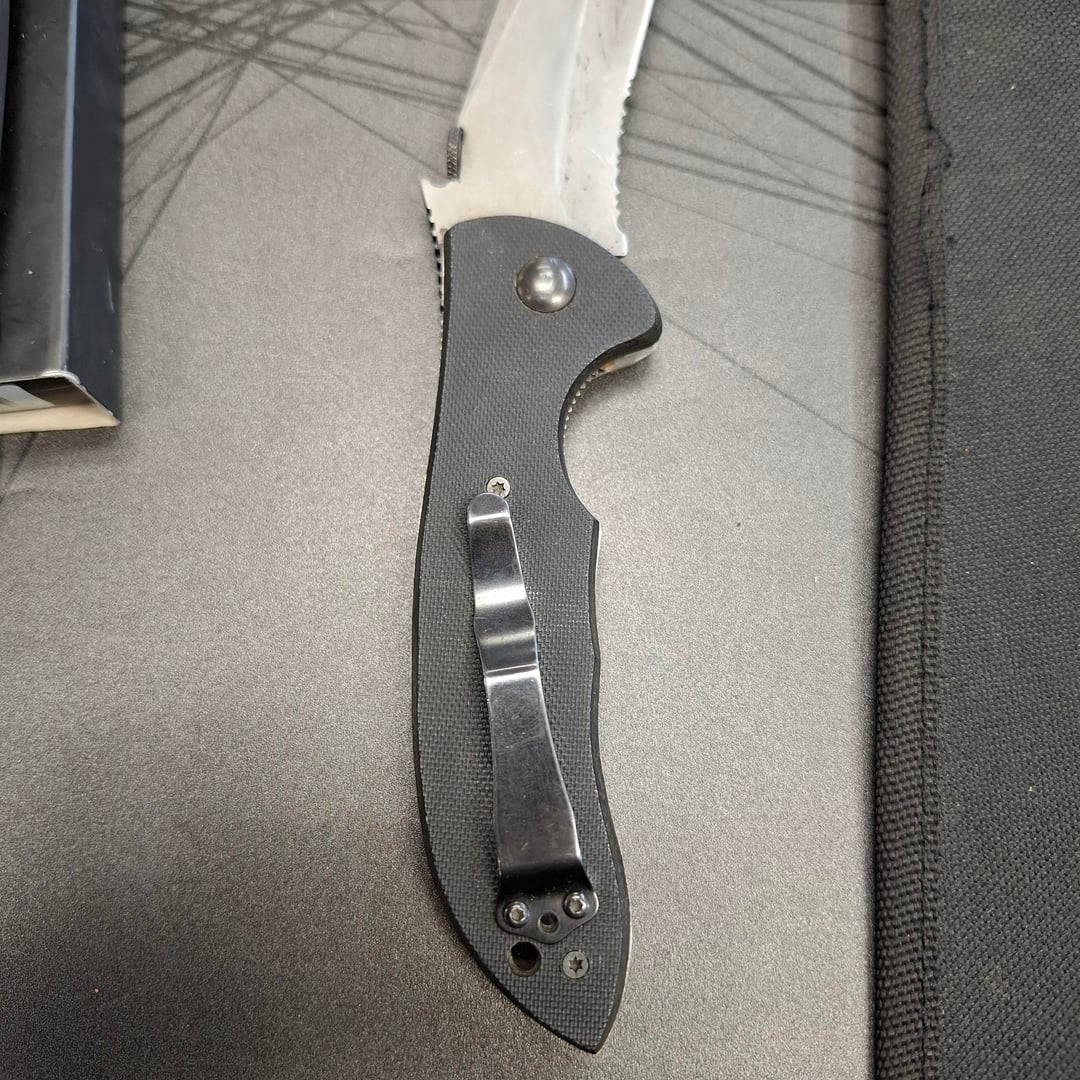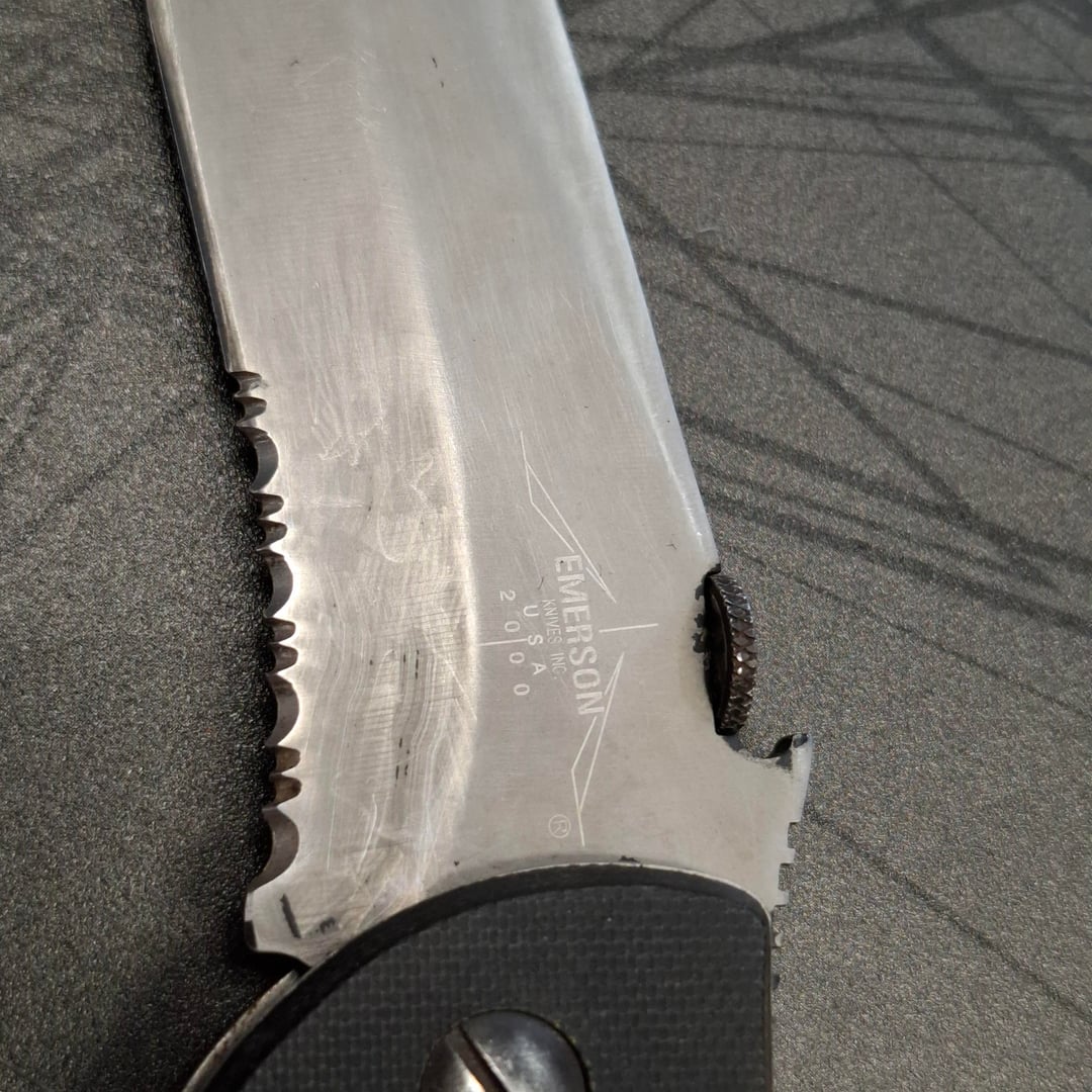 For the time period, Emerson logo was not on the pocket clips and the screw placement is correct in that the g-10 handle screwed directly into the titanium liners. The blade should be chisel ground on one side on the secondary bevel but it looks like someone ground the other side (locking side). I don’t know if that’s rust on the liners or just dirt but the liners should be titanium which shouldn’t be rusted. Hardware should be Philips or flat head and not Torx unless it was replaced. Looking closer, the pocket clip should be black oxide and that looks like cheap paint.