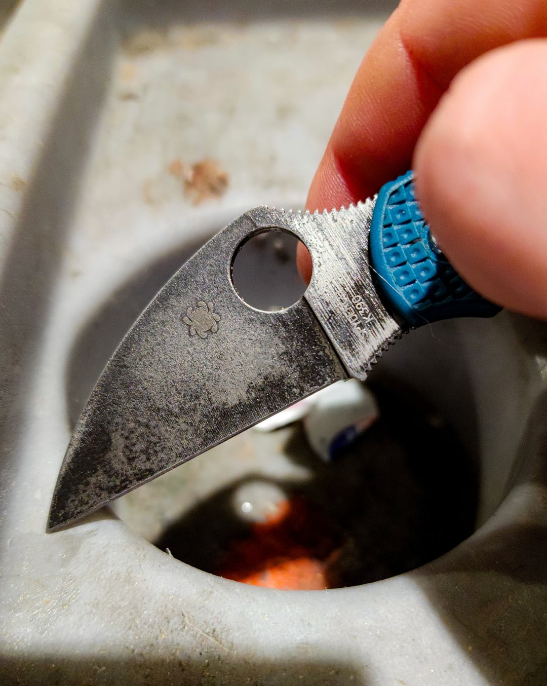 Boiled AC vinegar for roughly 10 to 15 minutes .. the etching really wasn't even noticeable until I started rock tumbling and then nearly the entire blade turned black especially the right side of the blade(first Pic) except for a few stubborn spots .. but I kept tumbling .. until I got this which I am not unhappy with at all..