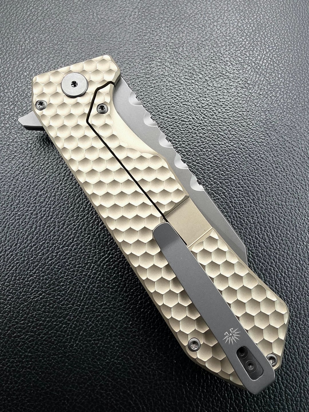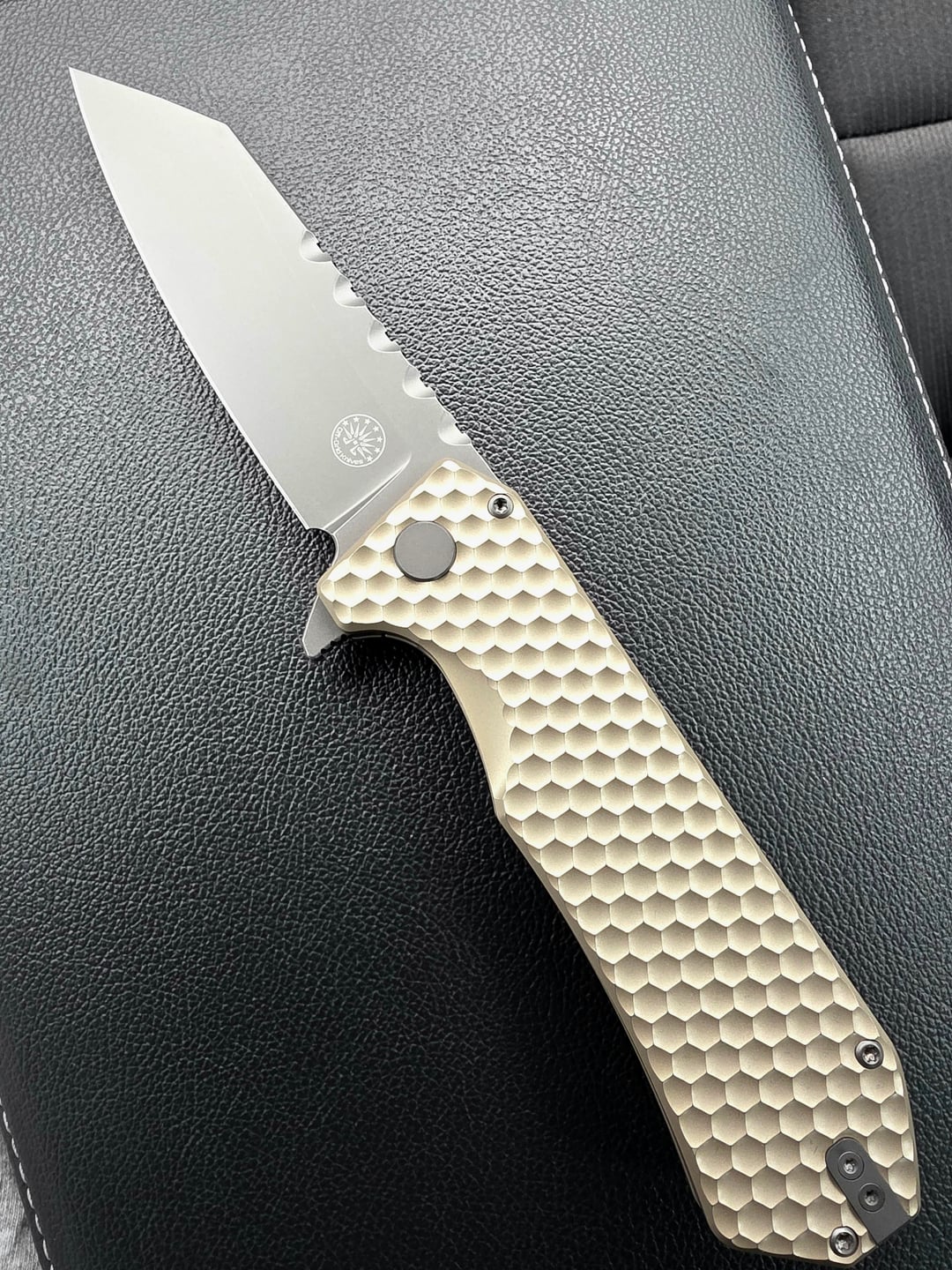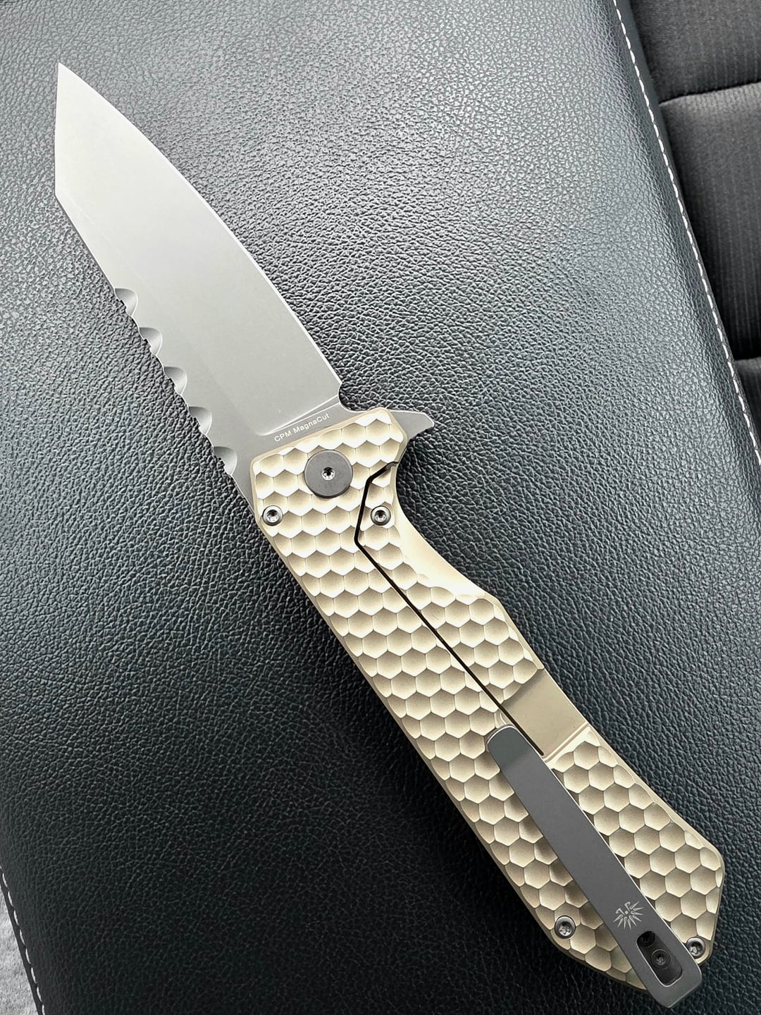Off-Grid Knives Mamba V3 in magnacut. It's a large one in hand, 4 inch blade and the gold/tan looks awesome. The golf ball dimples are very comfy and smooth, not jagged as they look. Not a pocket eater, in and out of pocket is smooth. Frame lock engagement is solid and it flicks out clean fast and smooth. Just gave it to him, he loves it!