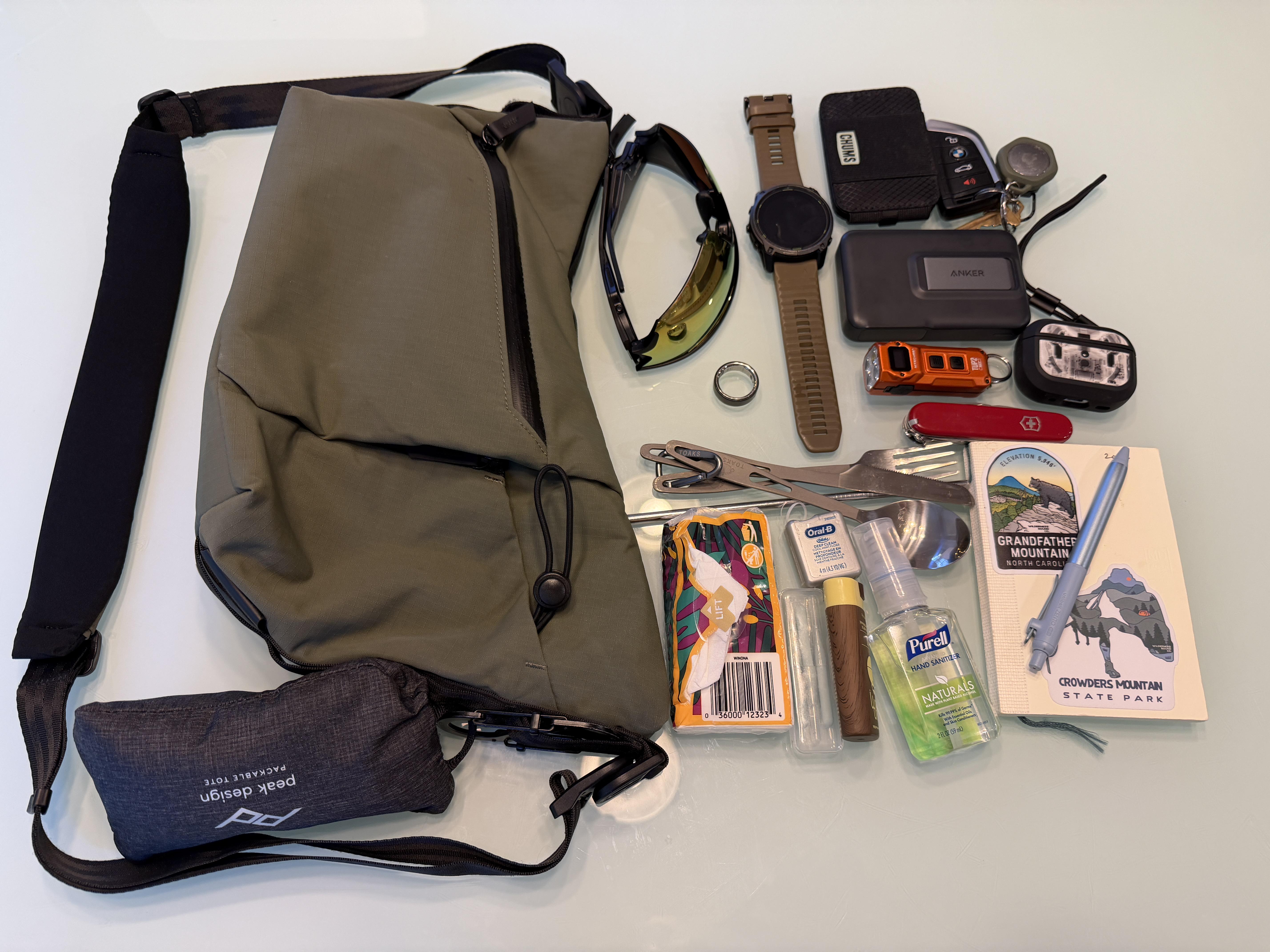 • Chums bifold wallet, keys, Swiss Army Super Tinker, Toaks cutlery set, metal straw, Midori A6 journal, Uni Zento 0.38mm, sunscreen, brushpicks, floss, hand sanitizer, kleenex