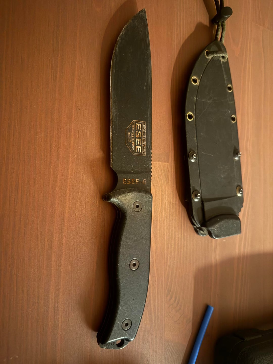 Not a expert with Esee but comparing to one I own and ones I’ve handled that looks legit most clones I’ve seen use different logos or the coating on the blade is different and the handle appears to be micarta which is what esee uses and the sheath looks legitimate. So form that I’d assume this is a real esee 6 in 1095 high carbon steel. The rusting on the engraving and edge happened on my real esee 3 after gutting a deer it comes with being high carbon. Great knives absolute beasts with the best warranty ever.