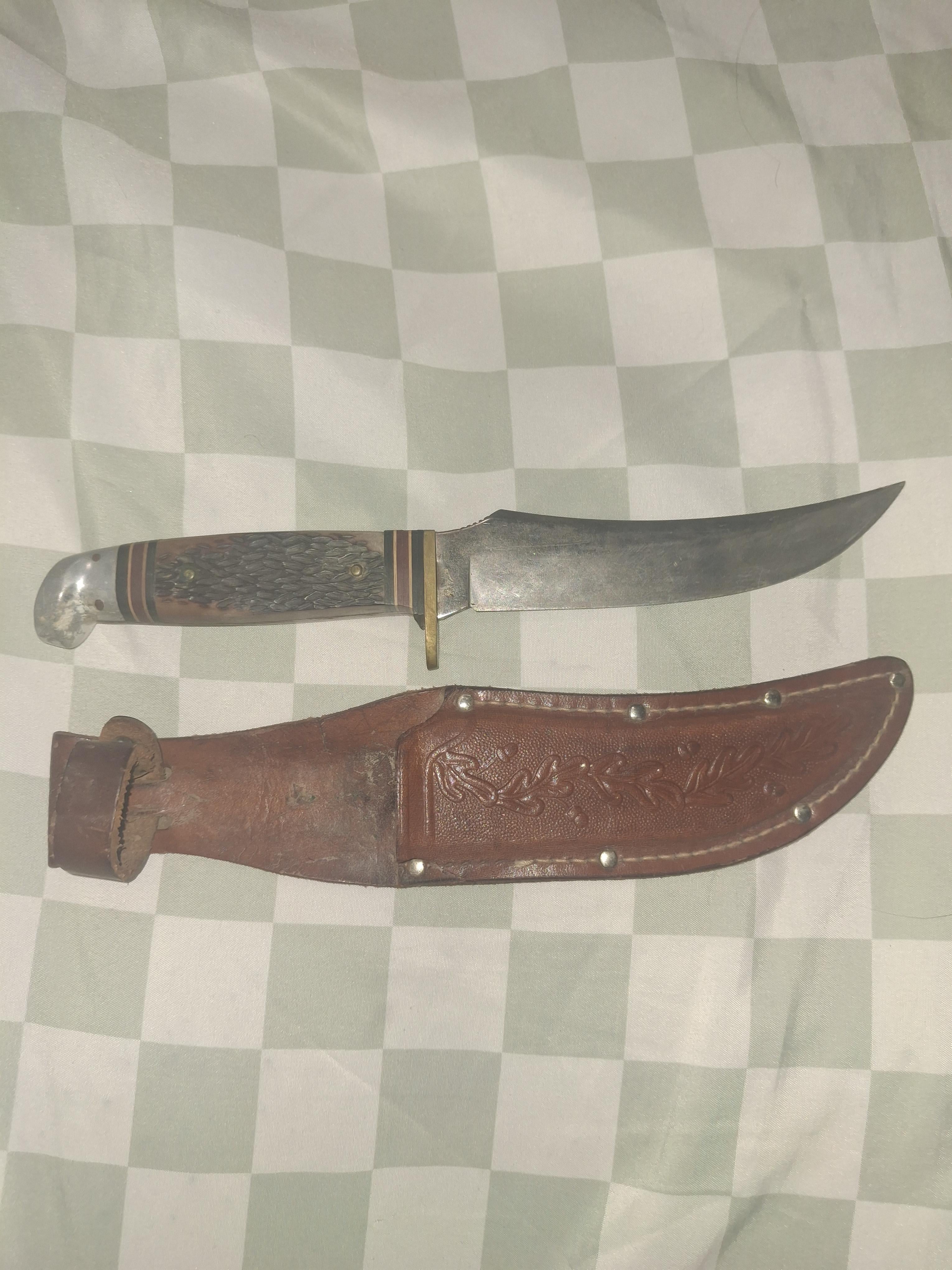 MoonSpider 4 hours ago An old hunting knife from Western Cutlery. Did a cursory search and it might be [the “W-39” model.](https://knife-market.com/listing/7mqzq339o4r-vintage-western-usa-w-39-fixed-blade-hunting-knife-leather-sheath-amazing-shape)