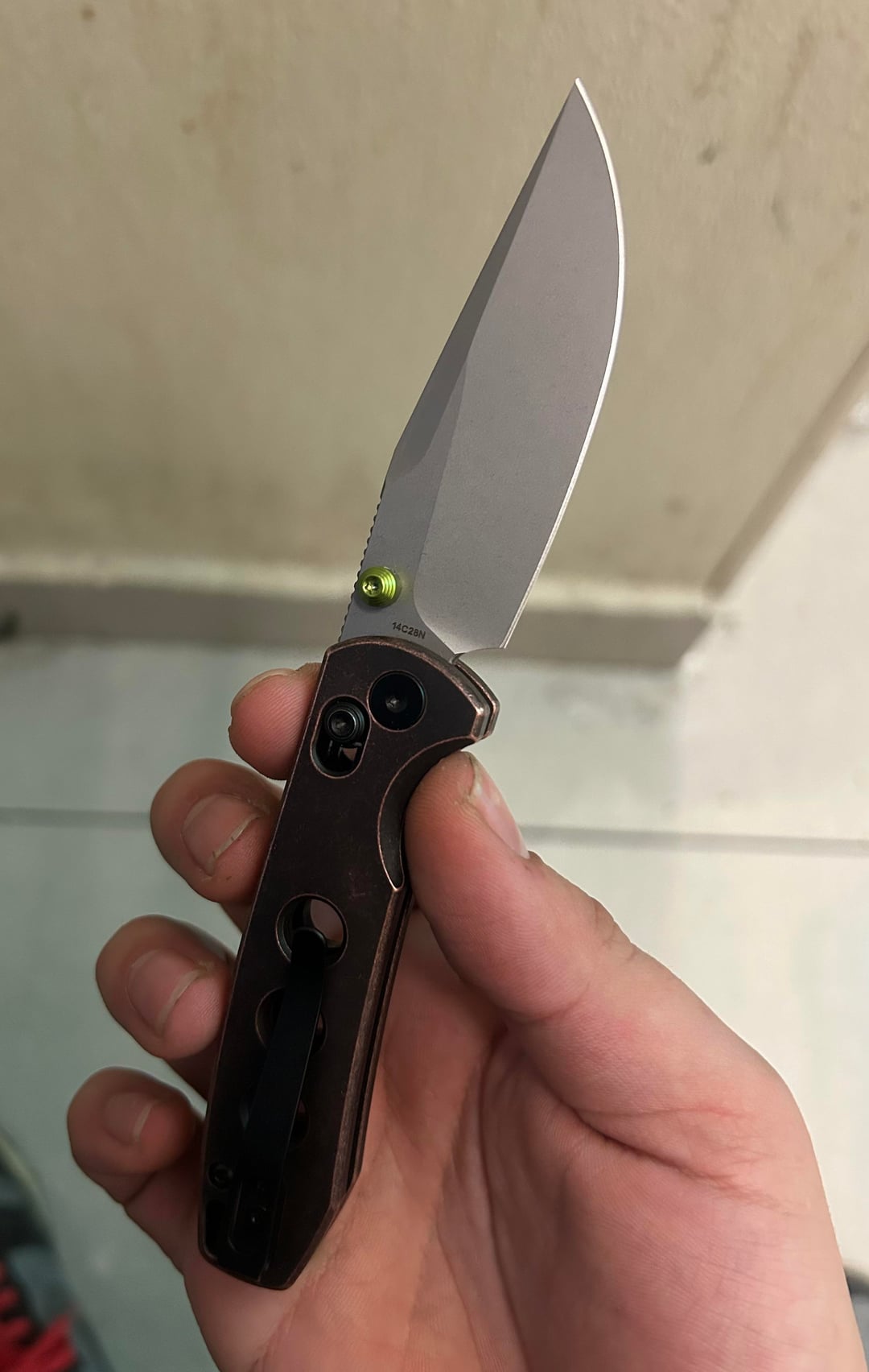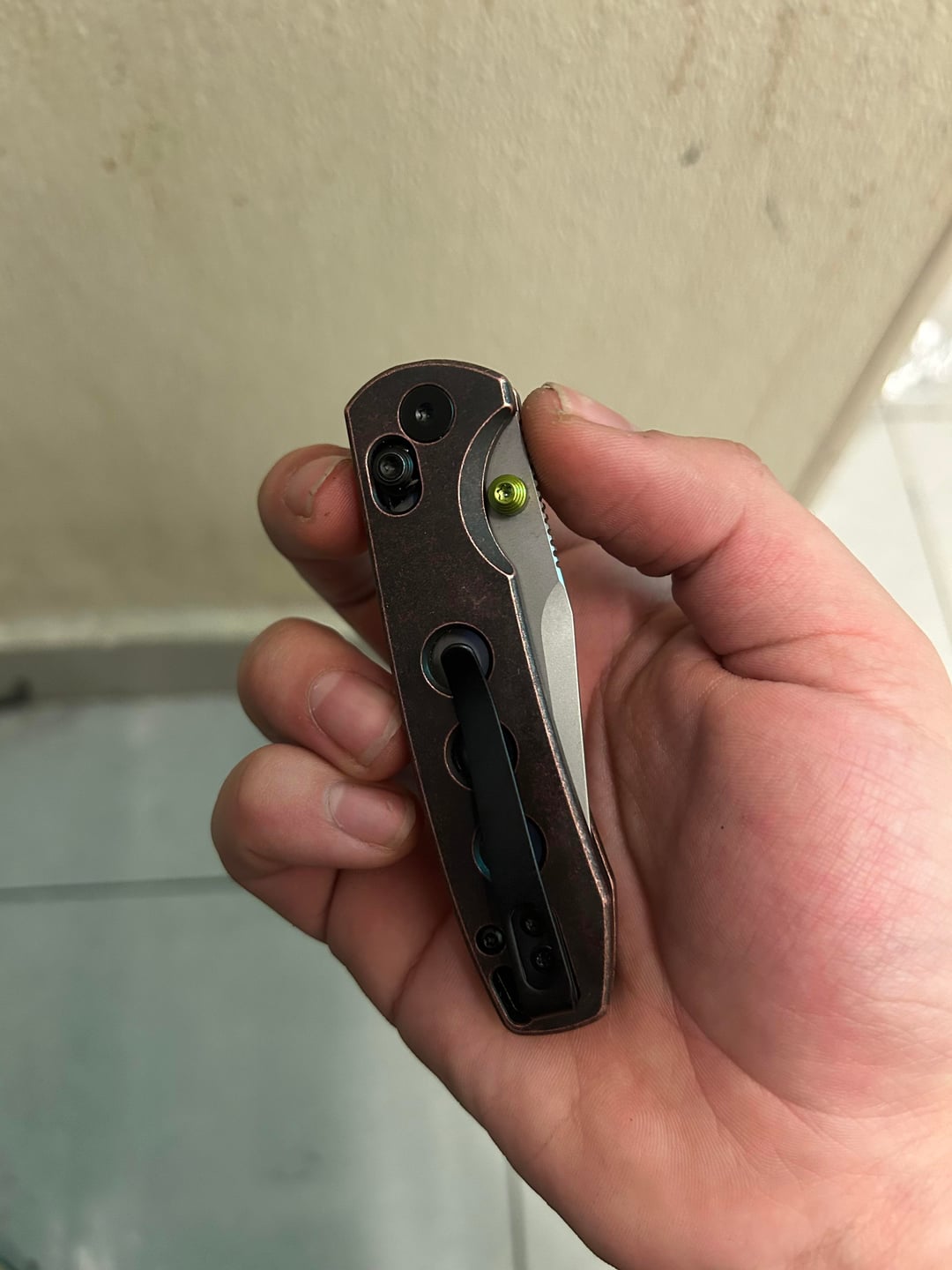 I don't really know what model it is but the action is super nice; the finish is very good, it arrived razor sharp out of the box. I've grown to really like it, the edge is nice and slicey, the pocket clip is deep carry and even as small as it is it's super comfortable to handle. Not too keen about the green accents, so i might paint them eventually, what are you carrying today?
